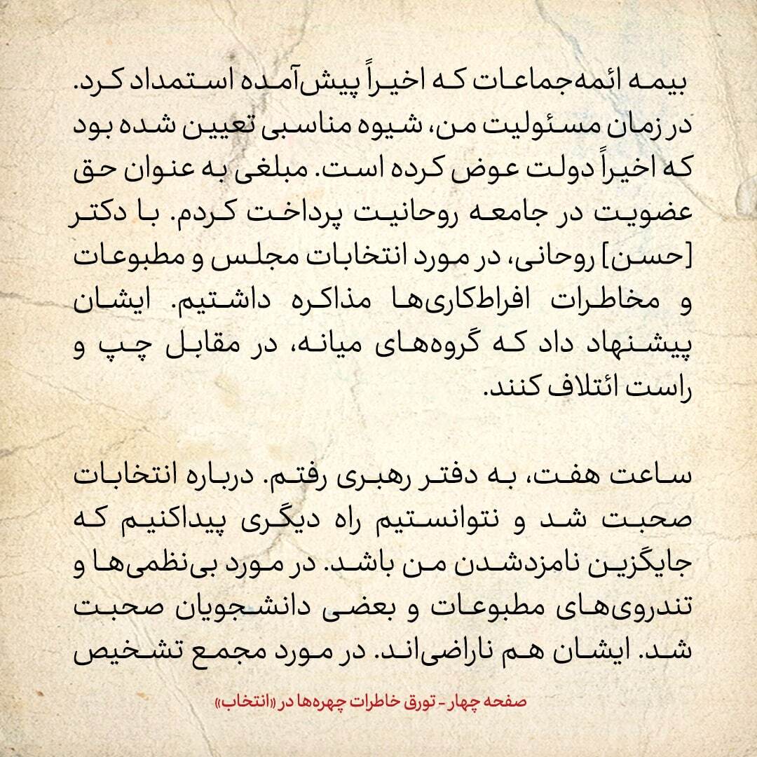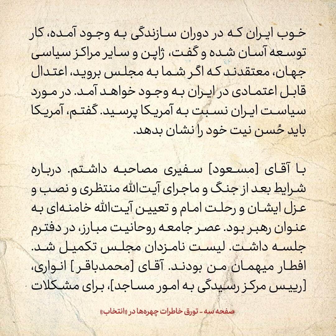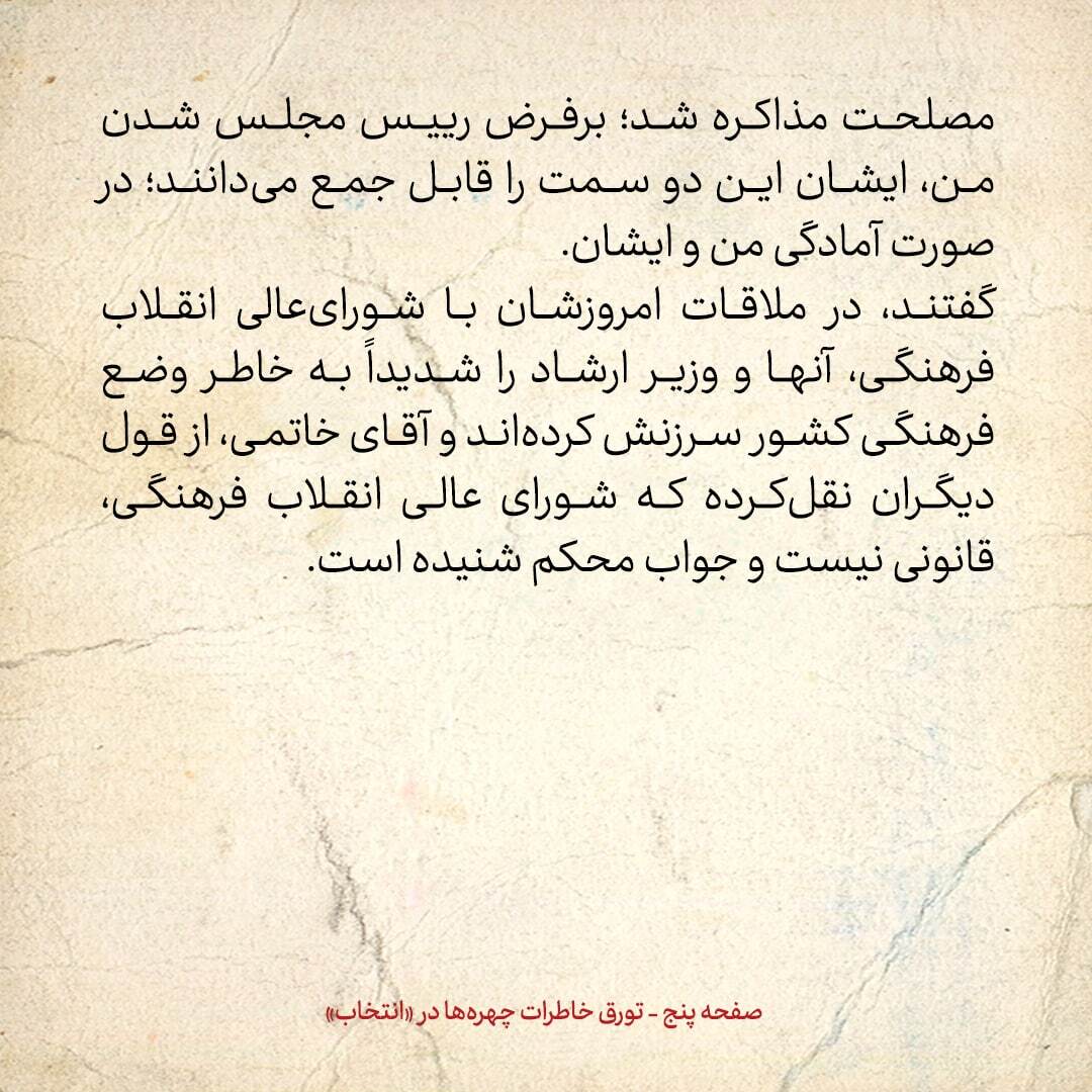خاطرات هاشمی رفسنجانی | انتخاب نوشت: در مورد بینظمیها و تندرویهای مطبوعات و بعضی دانشجویان صحبت شد. ایشان هم ناراضیاند. در مورد مجمع تشخیص مصلحت مذاکره شد؛ برفرض رییس مجلس شدن من، ایشان این دو سمت را قابل جمع میدانند؛ در صورت آمادگی من و ایشان. گفتند، در ملاقات امروزشان با شورایعالی انقلاب فرهنگی، آنها و وزیر ارشاد را شدیداً به خاطر وضع فرهنگی کشور سرزنش کردهاند و آقای خاتمی، از قول دیگران نقلکرده که شورای عالی انقلاب فرهنگی، قانونی نیست و جواب محکم شنیده است.
