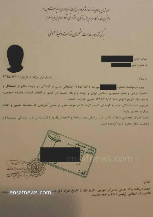 وی با ارسال تصویر برگ آماده به خدمت مشمولان خدمت وظیفه عمومی به انصاف نیوز نوشت: