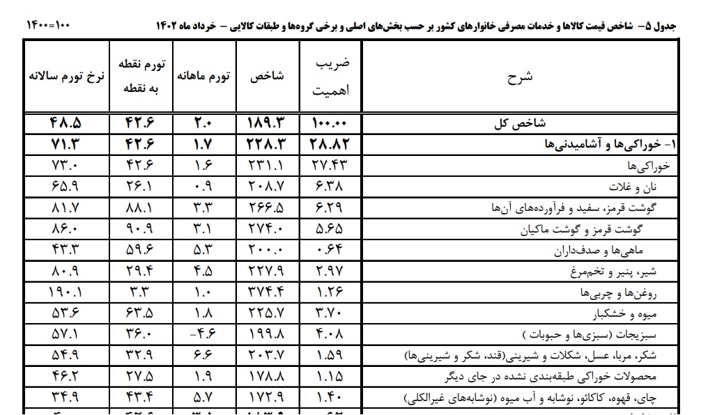 بر اساس گزارش مرکز آمار از نرخ تورم خرداد 402 ، شاخص تورم نقطه به نقطه، تورم ماهانه و تورم سالانه نسبت به گزارش مشابه ماه قبل کاهشی بوده است با این حال تورم اقلام خوراکی، همچنان بیش از 70 درصد است.