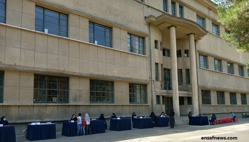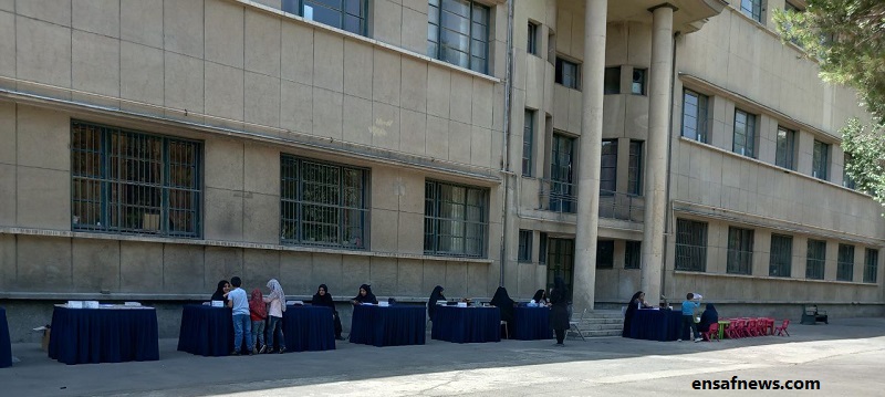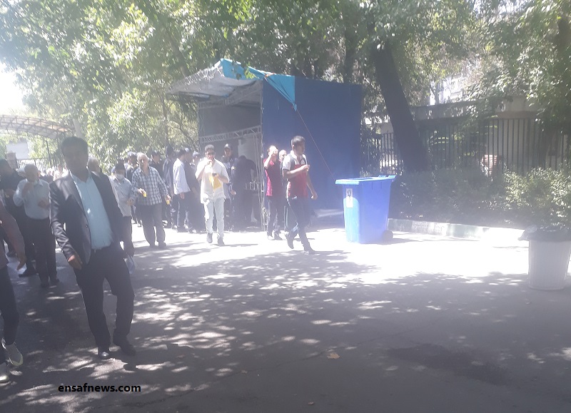 پس از عبور از گیتهای بازرسی یک ایستگاه صلواتی دیده میشود؛ شربت زعفرانی رنگ خنکی به مردمی که برای نماز وارد دانشگاه میشوند میدهند تا گرمای هوا کمی قابل تحملتر شود.