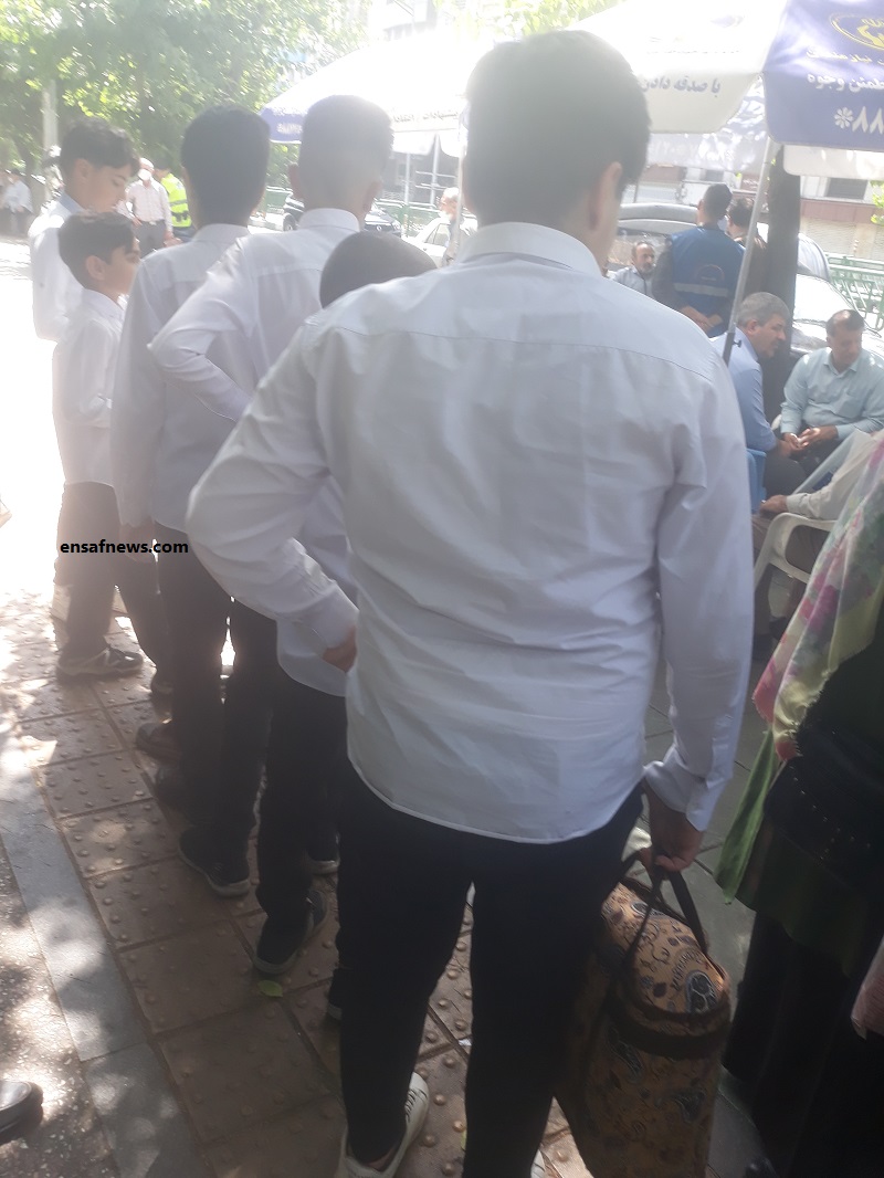 کنار صف اصلی صف کوچکی هم تشکیل شده است از دانشآموزان هفت تا نه ساله با موهای کوتاهشده و پیراهنی سفید بر تن. دو خانم چادری که ظاهرا ناظم مدرسهی آنان هستند هم کنارشان ایستادهاند و منتظرند تا درها به روی دانشآموزان مدرسهشان باز شود.