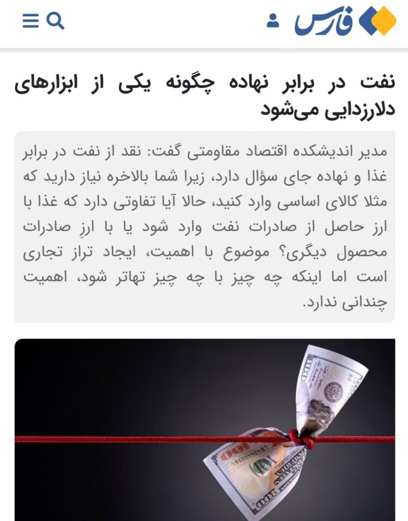 خبرگزاری اصولگرای فارس در گزارشی با تیتر «نفت در برابر غذا چگونه یکی از ابزارهای دلارزدایی میشود» که ساعتی پس از انتشار به «نفت در برابر نهاده چگونه یکی از ابزارهای دلارزدایی میشود» تغییر کرد، نوشت: