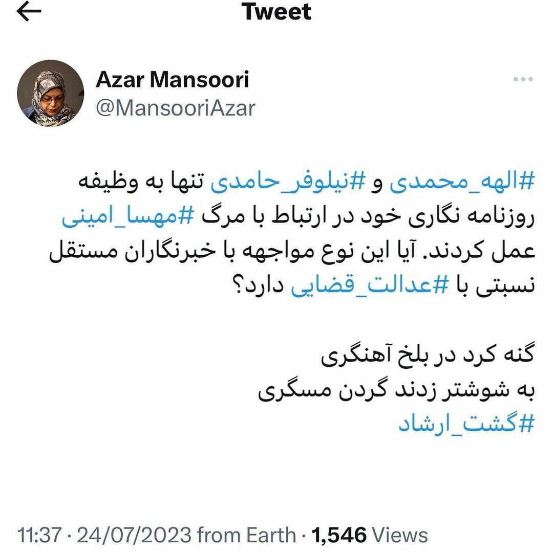 آذر منصوری، توییتی درباره الهه محمدی و نیلوفر حامدی منتشر کرد. انتهای پیام