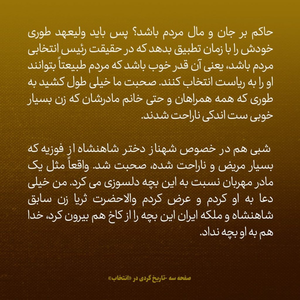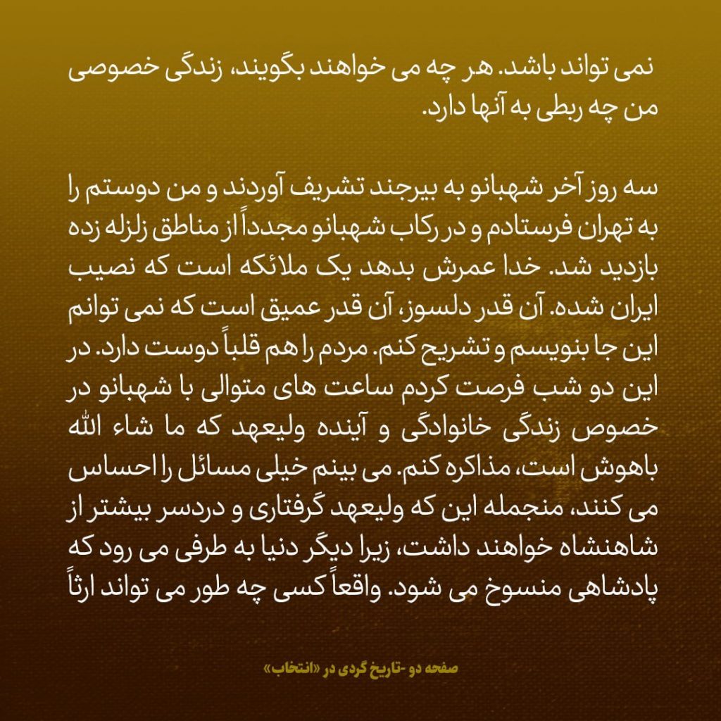 یادداشتهای اسدالله علم: خدایا چه روز بدی ست، دارم خفه می شوم. امروز که تلگرافات را می دیدم، تلگرافی به زبان آلمانی از زوریخ بود. چون آلمانی نمی دانم، دادم ترجمه کردند. خدایا چه بلایی به سرم آمد. دختر قشنگ ۲۰ ساله[ای] که چندی قبل دعوت کرده بودم به ایران آمده بود و شرح حالش را هم شاید در صفحات قبل داده بودم، مرده است. چه قدر زیبا و چه قدر عفیفه بود و چه حالاتی داشت. یک طرف زلزله می آید، یک طرف جنگ است، یک طرف خوبان می میرند. نفهمیدم. فلسفه این کارها را نمی فهمم.پایگاه خبری تحلیلی انتخاب (Entekhab.ir) :