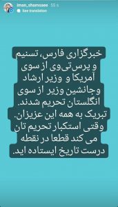 تبریک مدیرکل مطبوعات داخلی به فارس، تسنیم و وزیر بهدلیل تحریم آمریکا و انگلیس