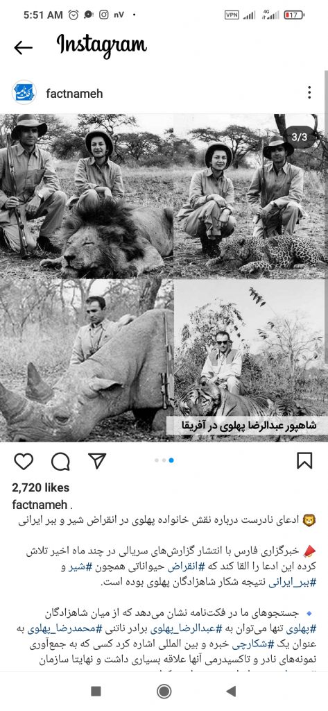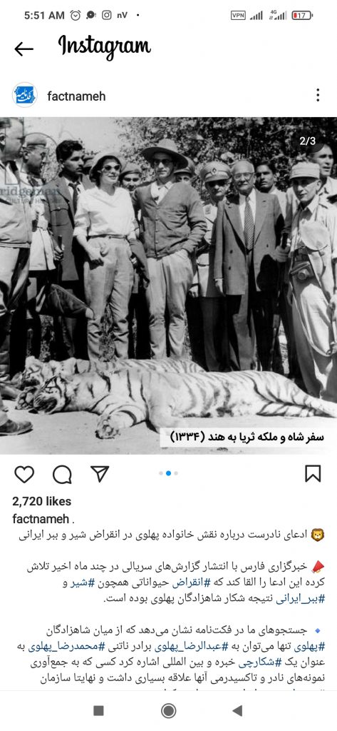 📣 خبرگزاری فارس با انتشار گزارش‌های سریالی در چند ماه اخیر تلاش کرده‌ این ادعا را القا کند که #انقراض حیواناتی همچون #شیر و #ببر_ایرانی نتیجه شکار شاهزادگان پهلوی بوده است.