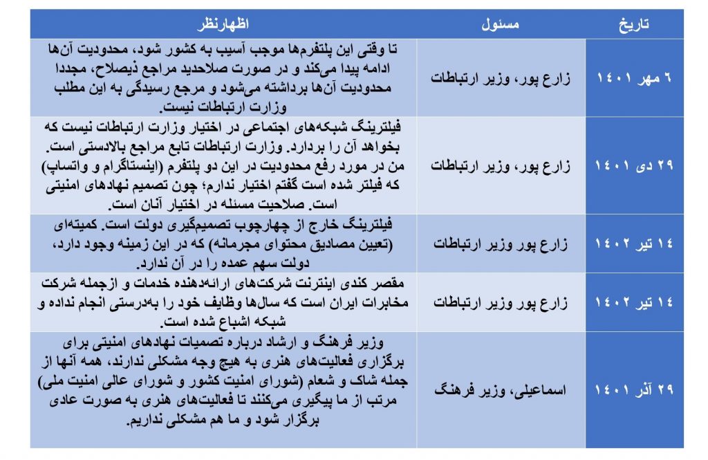 نگاهی گذرا به این جدول موید آن است که بین وزرای دولت سیزدهم، زارع پور وزیر ارتباطات ، رکورددار نپذیرفتن مسئولیت است. تاکید او بر مجری بودن وزارت ارتباطات و تبعیت از تصمیمات کارگروه تعیین مصادیق مجرمانه از آن جهت پذیرفتنی نیست که همین کارگروه در دوره روحانی، با همین ترکیب وجود داشت.