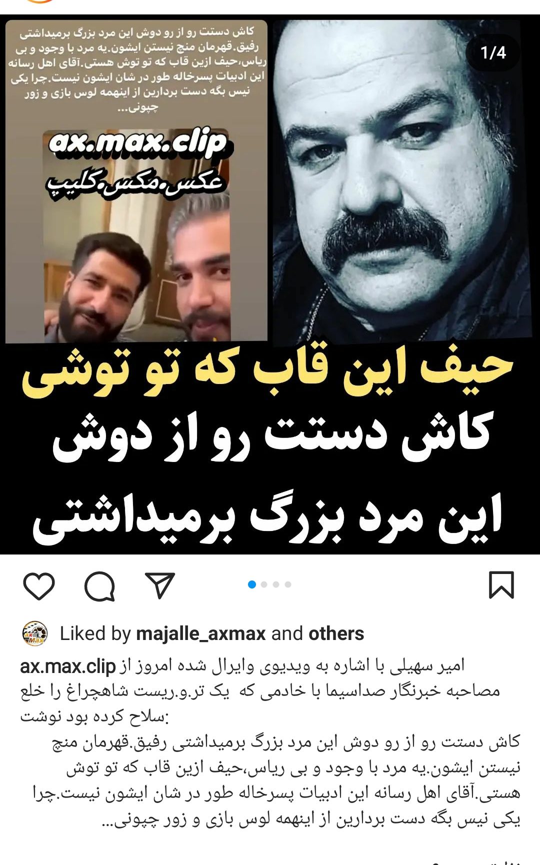امیر سهیلی به عکس گرفتن رضوانی، خبرنگار ۲۰:۳۰ که از مصاحبه های او میتوان به مصاحبه با روح الله زم اشاره کرد با خادم شاه چراغ اشاره کرد.