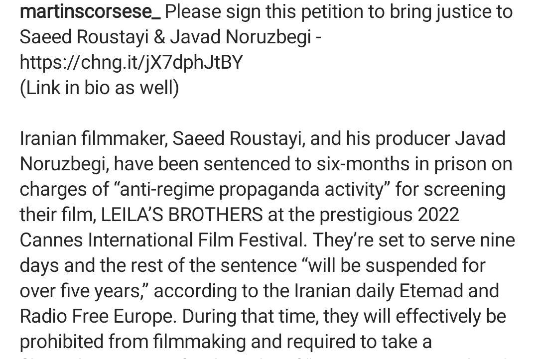 مارتین اسکورسیزی برای امضای یک کارزار درخواست کرده است و در پست خود به روزنامه اعتماد و رادیو اروپا درباره حکم روستایی ارجاع داده است.