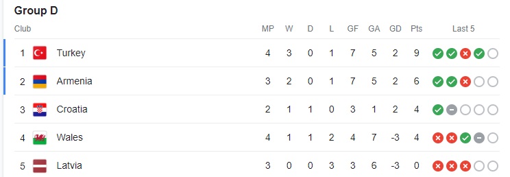 گروه D: کرواسی، ولز، ارمنستان، ترکیه، لتونی