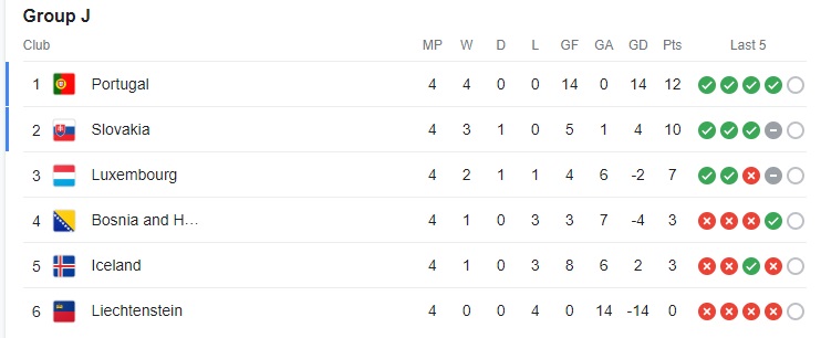 گروه J: پرتغال، بوسنی، ایسلند، لوکزامبورگ، اسلواکی، لیختن اشتاین