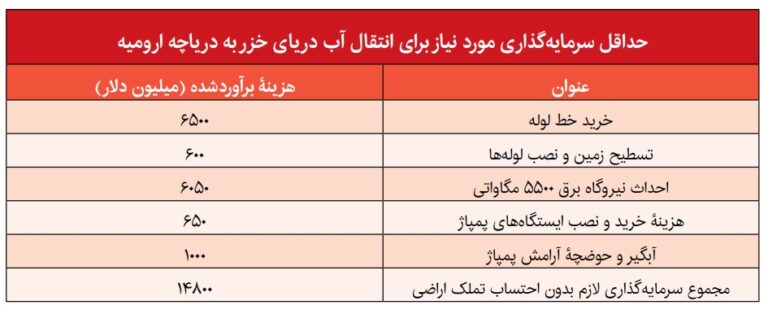 با هیچ منطقی برآورد هزینه 14.8 میلیارد برای انتقال 3 میلیارد متر مکعب در سال به دریاچه ارومیه با عقل نمی خواند، باید بسیار کمتر از هزینه خط انتقال به اصفهان باشد.