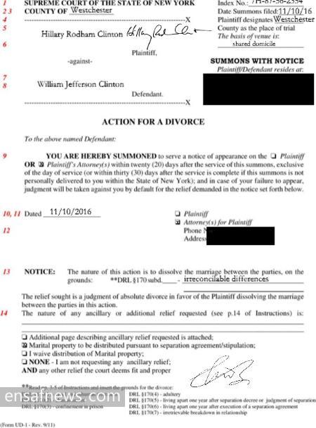 «وکلای هیلاری کلینتون – نامزد سابق دموکرات در انتخابات ریاست جمهوری آمریکا — پرونده‌ طلاق وی از بیل کلینتون را در دادگاه عالی ایالت نیویورک تنظیم کرده‌اند. به نظر می‌رسد هیلاری کلینتون به دلیل اختلافات عمیق با همسرش، تصمیم به طلاق گرفته است. در اسناد موجود، نام بیل کلینتون به عنوان مدعی علیه ذکر شده است. امضای هیلاری کلینتون نیز در بخش شاکی این پرونده‌ قابل مشاهده است. بر اساس گزارش‌ها، هیلاری و بیل کلینتون پیش از این به صورت توافقی از یکدیگر جدا شده بودند و تقسیم اموالشان را برای زمان به پایان رسیدن روند طلاق ذکر کرده بودند. در حال حاضر، هیلاری و بیل کلینتون درباره این مسئله اظهار نظر نکرده‌اند.»