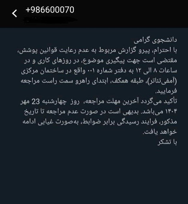 پیامک تذکر حجاب | «خوابگاهت رو می‌گیریم»