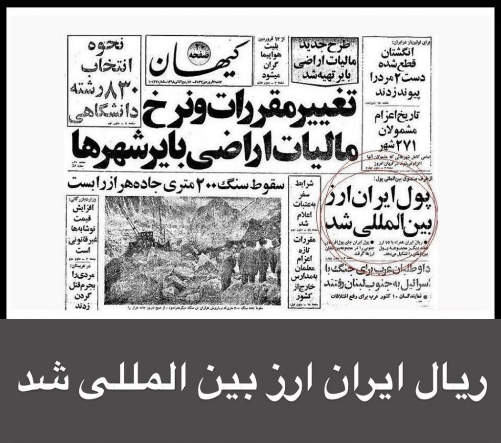 تصویری از روزنامه کیهان سال فروردین ۱۳۵۷ / ریال ارز بین المللی شد