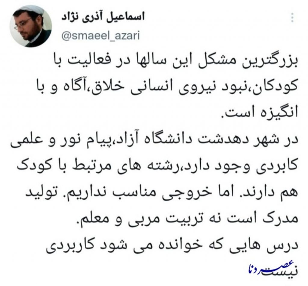 توییت یک طلبه ایرانی و فعال در حوزهی آموزش کودکان درباره مشکلات آموزشی کودکان در پایگاه خبری عصر دنا منتشر شده است.