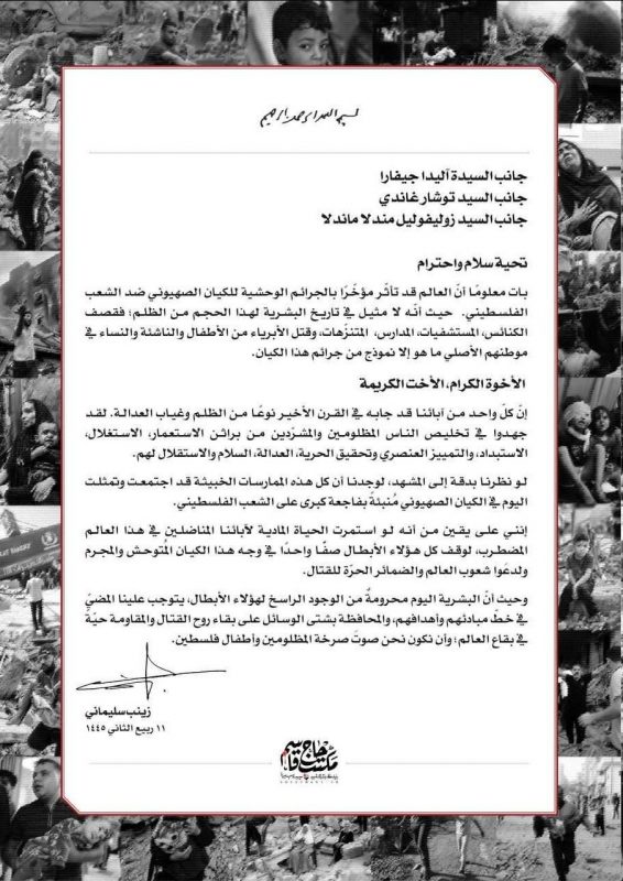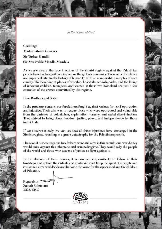 «زینب سلیمانی در نامهای به به نوادگان گاندی و ماندلا و دختر چهگوارا نوشت: ایمان دارم اگر حیات مادی پدران مبارز ما در این جهان پرآشوب ادامه داشت، همگی این قهرمانان، در صفی واحد علیه رژیم ضدبشری و جنایتکار صهیونیستی بهپا میخواستند و مردم جهان و وجدانهای آزاده را به مبارزه فرا میخواندند.