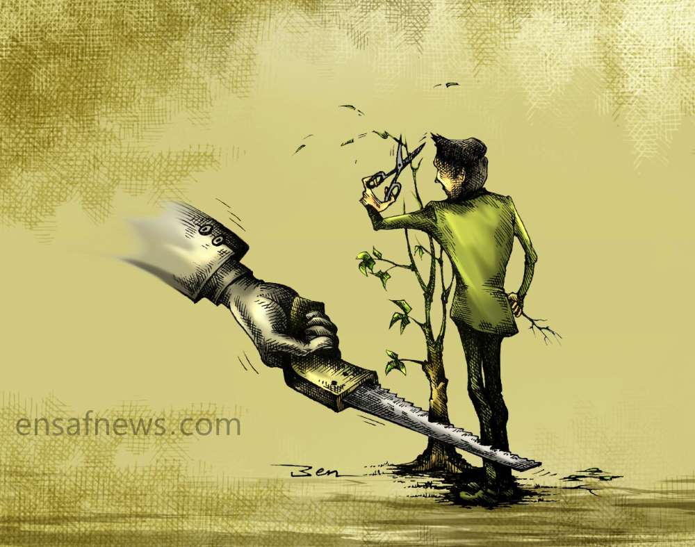 کارتون «اصلاح ساقهها - قطع پایهها»، کاری از «بنیامین آل علی»، کارتونیست انصاف نیوز. انتهای پیام