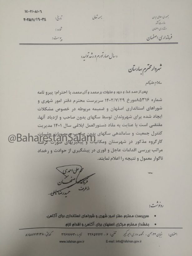و نامه فرمانداری اصفهان به شهرداری بهارستان: