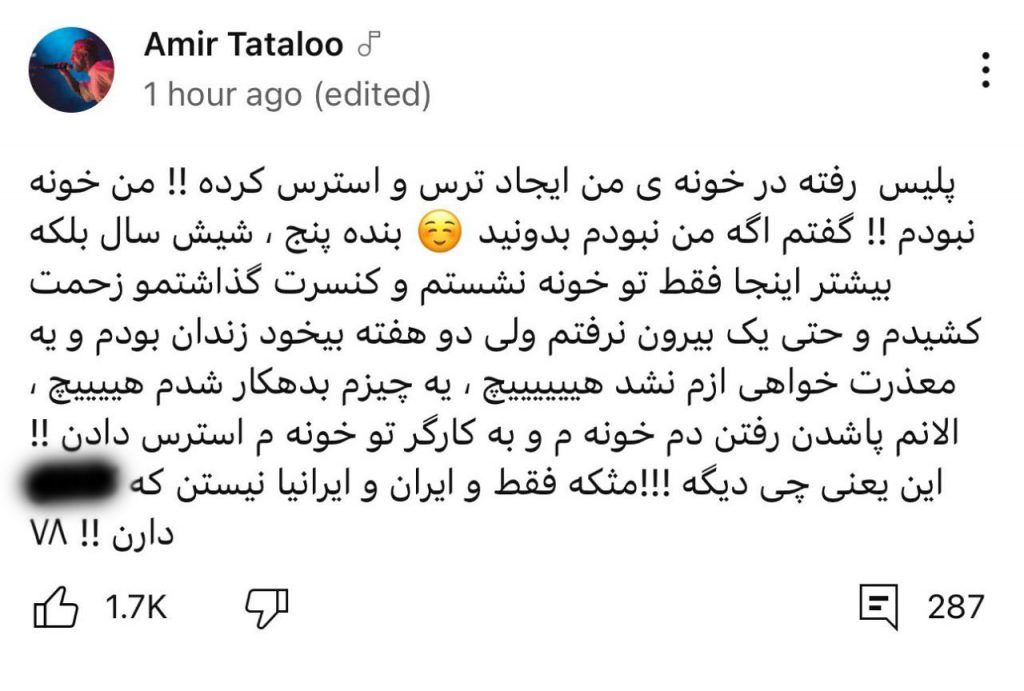 امیرحسین مقصودلو معروف به تتلو در ادعایی تازه اظهار داشته که پلیس ترکیه به منزل او مراجعه کرده که باعث ناراحتی خواننده مشهور گردیده است. در برخی رسانهها، مراجعه پلیس ترکیه به منزل او «در صورت صحت ادعای وی»، ناشی از افشاگریهای سحر قریشی و در پی گزارش هایی مبنی بر آزار و اذیت دختران جوان و نوجوان عنوان شده است.
