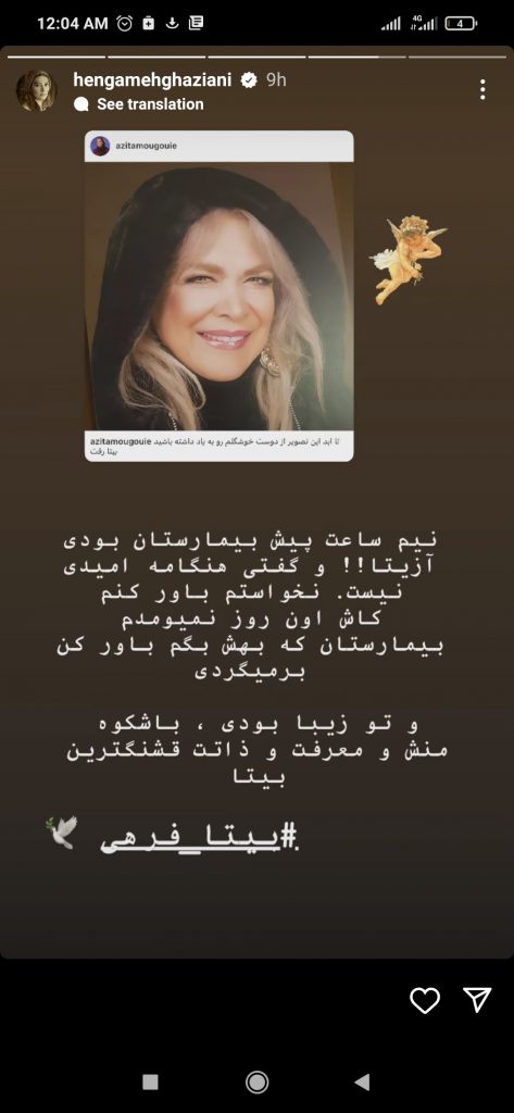 استوری هنگامه قاضیانی برای فوت بیتا فرهی را ببینید. انتهای پیام