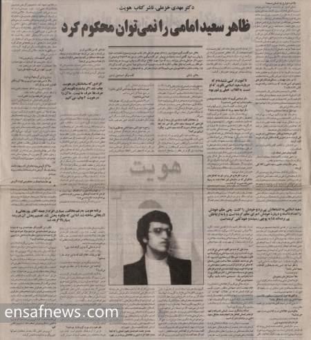 به گزارش انصاف نیوز، وی که بنا به گفتههای خودش در آن سالها با سعید امامی (یا سعید اسلامی) جلساتی داشته، پس از پخش برنامهی تلویزیونی هویت دربارهی چندین چهرهی فرهنگی و سیاسی شناخته شده، کتاب آن را با مقدمهی حمایتی و تند خود چاپ کرده بود، در آن ایام علی رغم اعتراض تعدادی از چهرههای نمایش داده در آن فیلم، آنها را حتی مستحق دفاع نمیدانست.