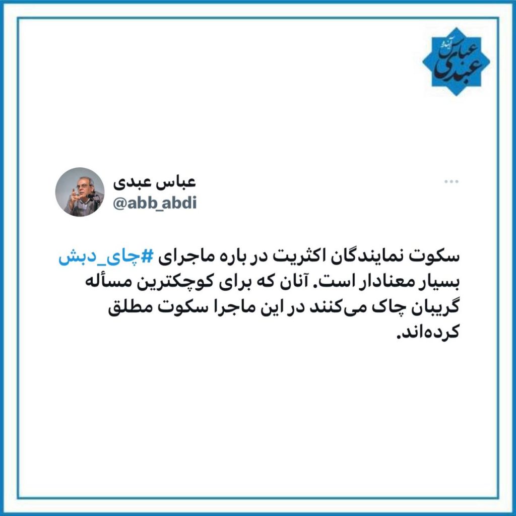 عباس عبدی، فعال سیاسی در یک توییت نوشت: سکوت نمایندگان اکثریت درباره ماجرای چای دبش بسیار معنادار است. آنان که برای کوچکترین مسئله گریبان چاک می کنند در این ماجرا سکوت مطلق کرده اند.