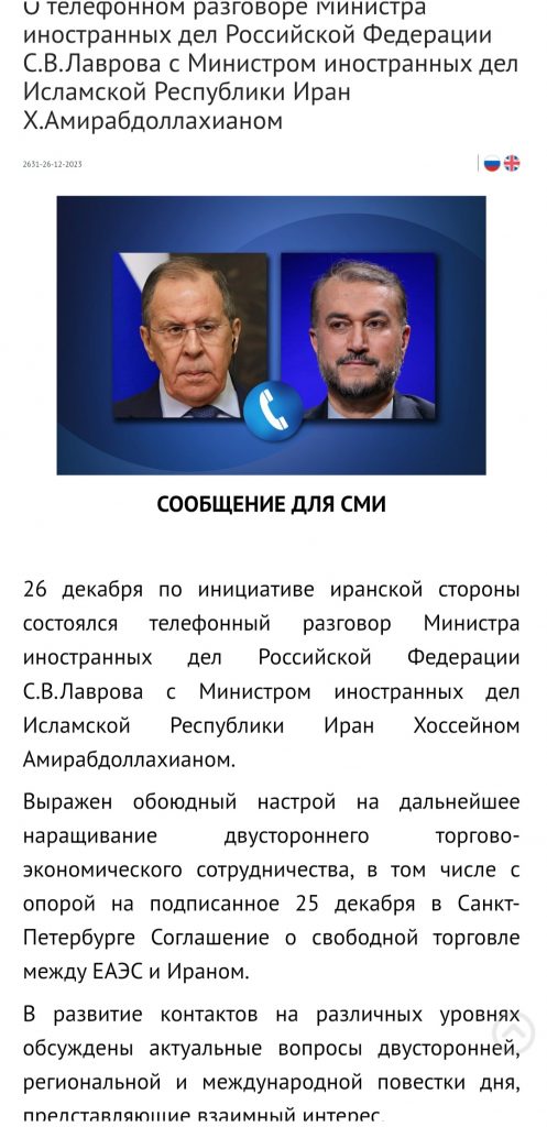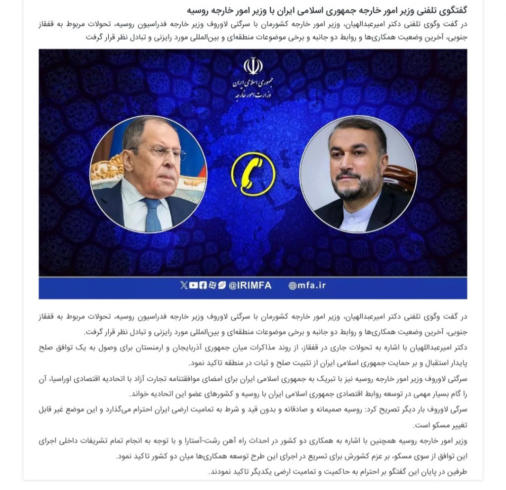 روز گذشته خبری در سایت رسمی وزارت خارجه از گفت و گوی تلفنی آقای امیر عبداللهیان با سرگی لاورف منتشر شد. در این خبر، آمده است: «سرگی لاوروف بار دیگر تصریح کرد، روسیه صمیمانه و صادقانه و بدون قید و شرط به تمامیت ارضی ایران احترام میگذارد و این موضع غیر قابل تغییر مسکو است». این گزارش، از سوی برخی خبرگزاری های داخلی نیز باز نشر شد و حتی برخی از آن به بازپس گیری و اصلاح موضع روسیه یاد کردند.