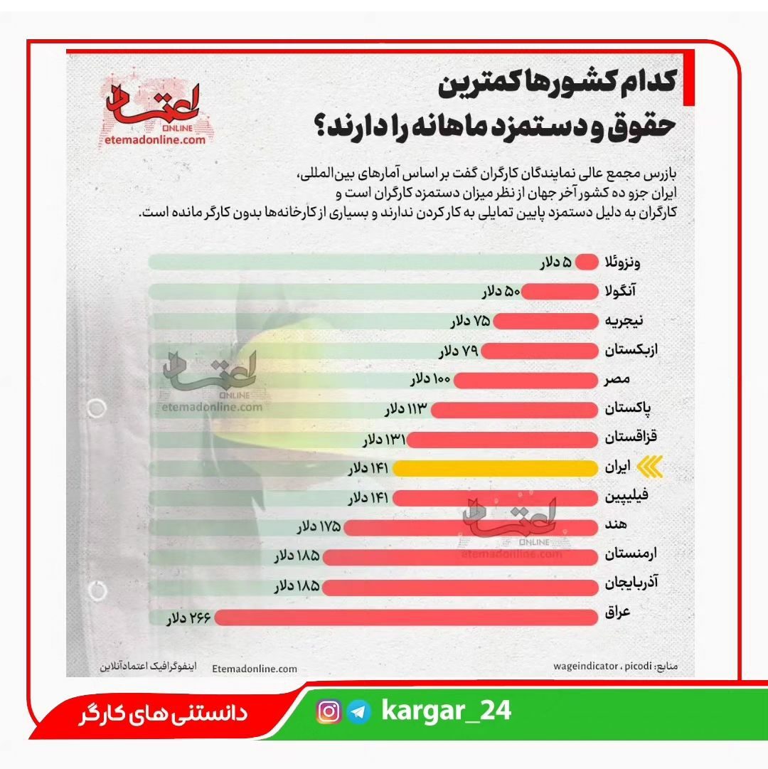 حقوق و دستمزد ماهانه کارگران ایرانی از آخر در جایگاه هشتم قرار دارد