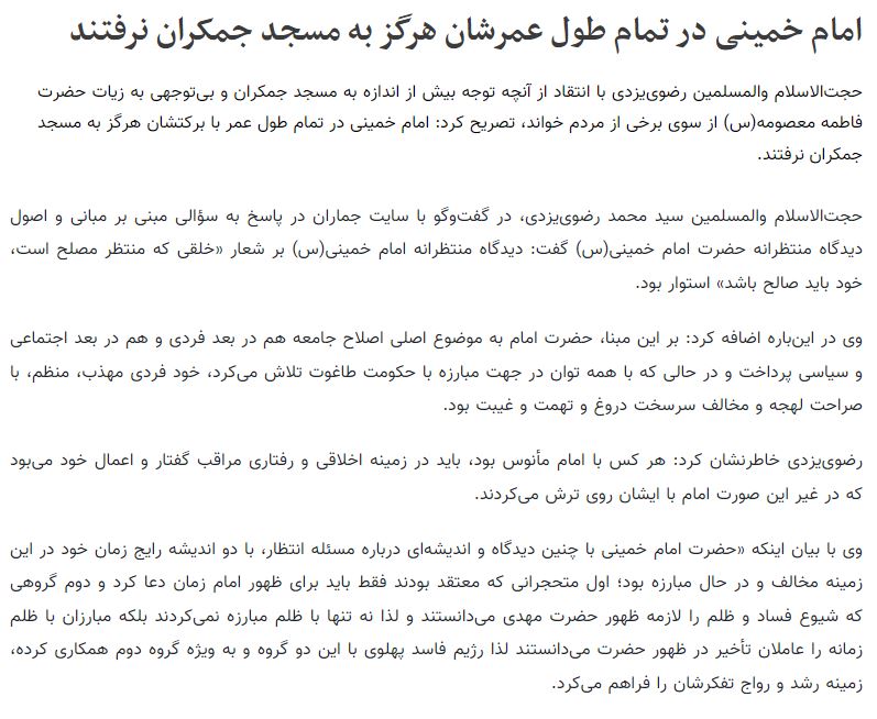 این ادعا درحالی مطرح شده که کمی جستجو در صحیفه امام خمینی (ره) که تنها مرجع قابل استناد پیرامون سخنان و مواضع امام است، نشان از ارادت ویژه ایشان به مسجد مقدس جمکران دارد؛ تا جایی که در جلد هـفتم – صفحه ۱۹۵ صحیفه آمده است: «… با توجه به اينكه مسجد مقدس جمكران يادگاری عظيم از حضرت ولی عصر – ارواحنا فداه -بوده و آن سرور امر به ساختن آن مسجد و توجه شيعيان به آن نموده اند، «طبق روايت مرحوم شيخ صدوق – رضوان الله عليه» بنابراين وقف عام محسوب شده و امر توليت آن با حاكم شرع بوده و اداره آن زير نظر حاكم شرع با هياتی از عدول مومنين و ثقات مطلع امين و علاقهمند به آن جناب «علیهالسلام» بايد باشد؛ و كليه اموال و عوايد حاصله بايد با حفظ مصالح مسجد دقيقا صرف عمران و توسعه و رفع نيازمندیهای آن مكان توسط هيات مذكور شود؛ و اعضای اين هيات صرفنظر از عشق به خدمت در راه اسلام، سزاوار است كه اين خدمت را افتخاری انجام دهند.» سال گذشته نیز معصومه ابتکار،در گفتوگویی با سایت پرتال امام خمینی(ره) سخنانی ناروا را به امام نسبت داد. معصومه ابتکار در دروغی آشکار گفته بود: «در ابتدای انقلاب بحث اجباری شدن حجاب مطرح نبود. حجاب انتخابی بود و جالب اینجا بود که اکثریت هم به این سمت آمدند و حجاب را انتخاب کرده بودند. بدون اینکه کسی به آنها امر کند. امام از ابتدا با این نگاههای سختگیرانه و افرادی که موضع صرفاً فقهی داشتند و حتی ابعاد اجتماعی و روانشناختی موضوع را نمیدیدند، درگیر بودند.».