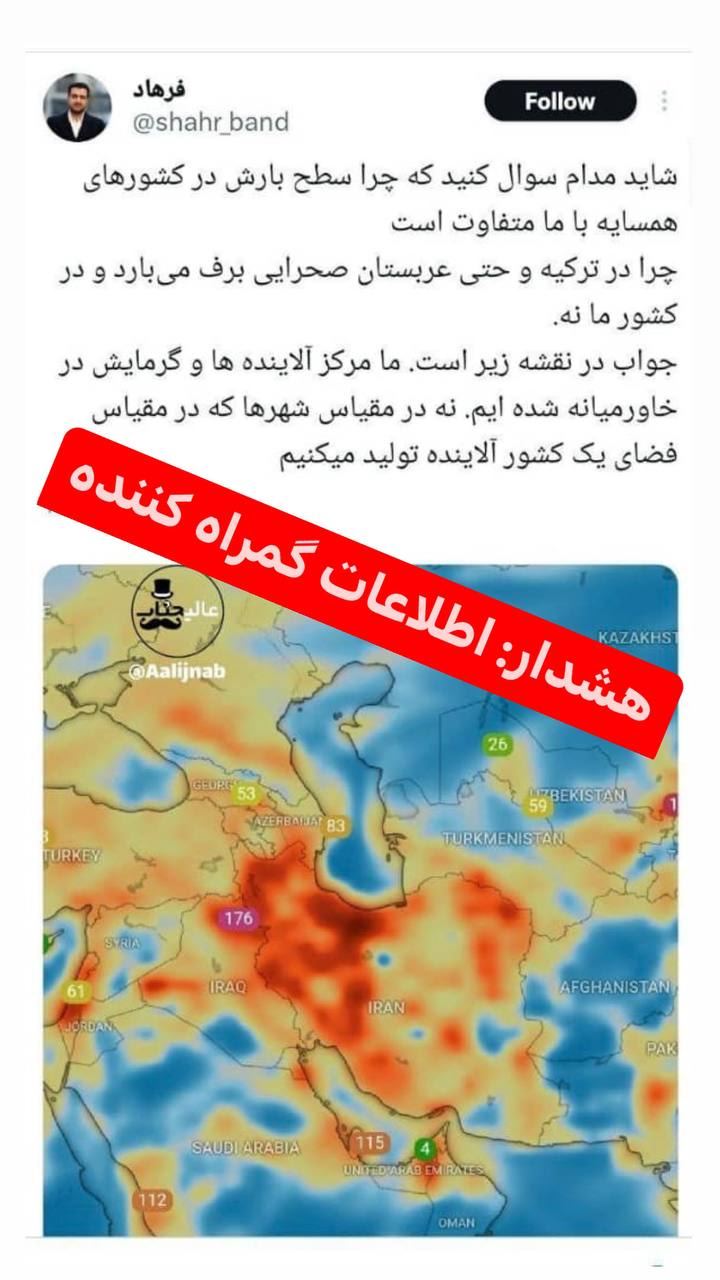 هر چند که آلودگی هوا و گرمایش منطقهای و جهانی میتواند به کاهش بارش، افزایش گرما و تبدیل برف به باران کمک کند، معرفی آلایندهها به عنوان عامل خشکی ایران در سال جاری با اتکا به یک نقشه رنگی حرکتی ضد علمی و عامل تشویش اذهان عموم غیرمتخصص و نگران است و ما را از مسیر یافتن راه حل مناسب دور میکند.