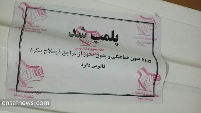 شب گذشته عدهای از اعضای یکی از سازمانهای دانشجویی دانشگاه خیام مشهد با حملهی شبانه به دفتر انجمن اسلامی دانشجویان این دانشگاه نسبت به تخلیهی دفتر و تغییر قفل، کاغذی روی آن چسباندند به عنوان «پلمپ شد»!