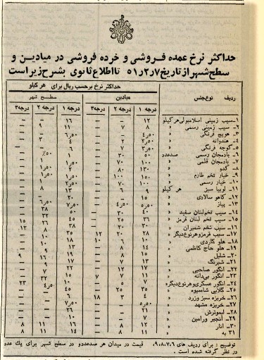 این نرخی بود که شهرداری تهران اعلام و در مطبوعات درج میکرد. شهرداری پایتخت برای هندوانه درجه یک در میادین کیلویی 4 ریال قیمت مشخص کرده بود. هندوانه درجه دو در میادین کیلویی 3 ریال و در میوهفروشیهای سطح شهر کیلویی 4/5 ریال (4 زار و 10 شاهی) قیمتگذاری شده بود.