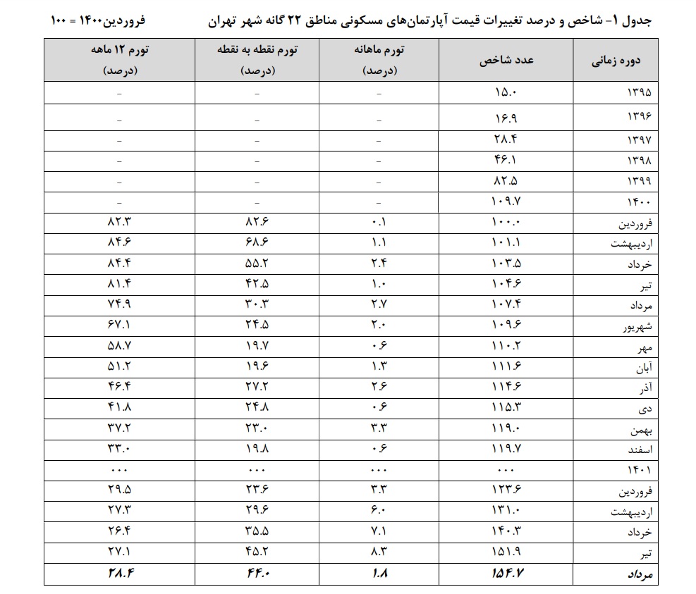 طبق جدولی که در میانه این گزارش درج شده، از سال 1395 تا مرداد 1401 شاخص از عدد 15 به 154 رسیده و این یعنی قیمت هر متر مربع آپارتمان مسکونی در تهران بیش از 10 برابر شده و به این معنا میتوان با اطمینان گفت برای تعداد بیشتری از ساکنان پایتخت «خانهدار شدن» به یک آرزوی محال و دستنیافتنی تبدیل شده است.