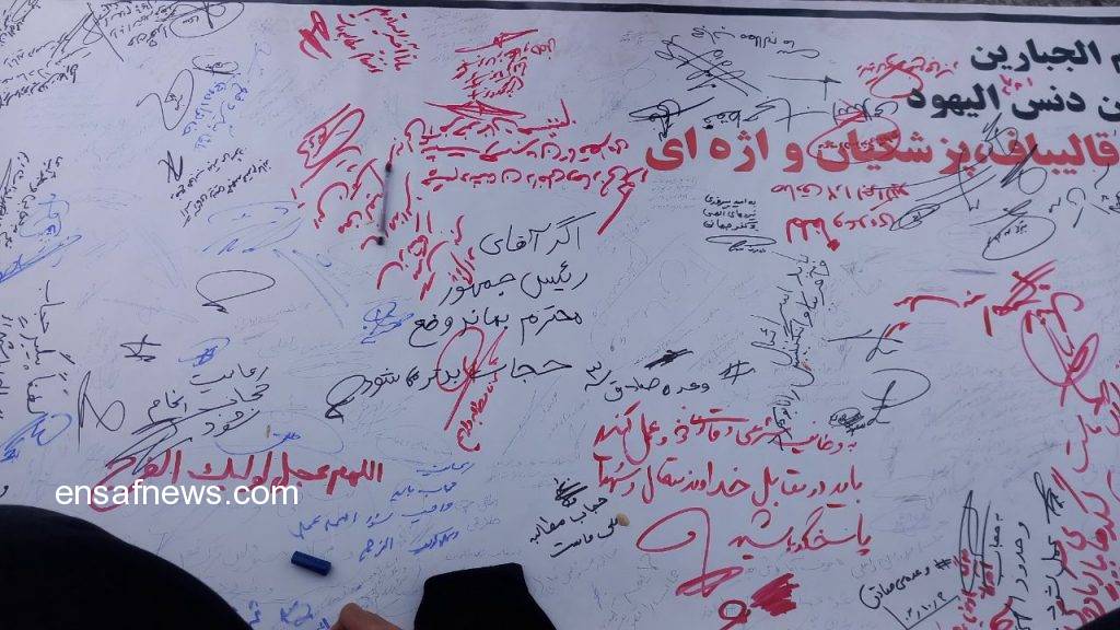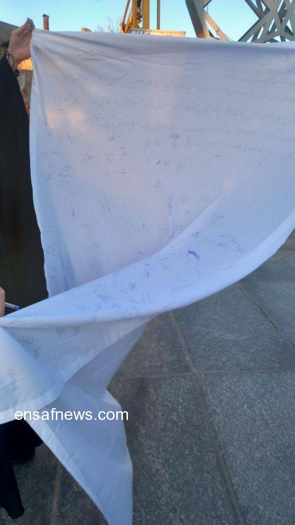 دختر جوانی که دیگر داشت از پا هم میافتاد روی یک پارچه برای اجرایی شدن قانون عفاف و حجاب امضا جمع میکرد. در پایان نوشتهاش نام مدرسه علمیه نورالزهرا بود آمده بود.