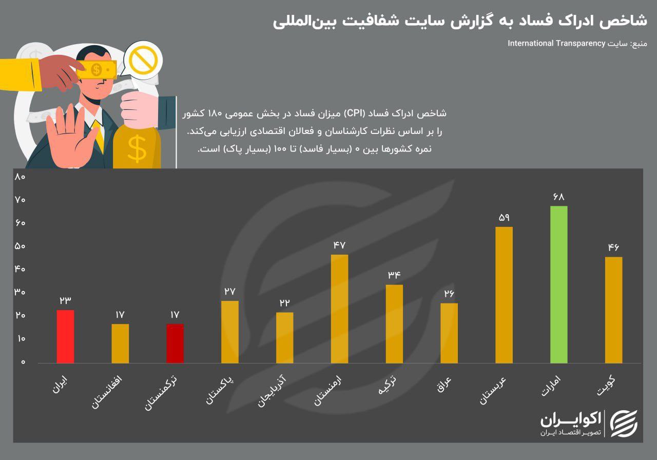 ایران در میزان فساد بخش عمومی، در میان ۱۱ کشور منطقه، با نمره ۲۳ در وضعیت «نسبتا نامطلوب» قرار گرفت. امارات و عربستان با نمرههای ۶۸ و ۵۹ بهترین عملکرد را دارند.