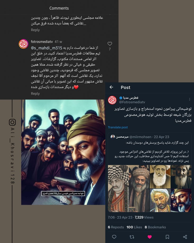 کمی بعدتر، به دلیل سوالات و کنجکاوی مخاطبین از منابع مورد استناد، فطرس مدیا، در توییتر توضیحاتی ارائه داد. اما در این توضیحات تصویر خواجه نصیر تنها از یک نقاشی خیالی و انتزاعی بازسازی شده بود بدون ارائهی هیچ سندی!