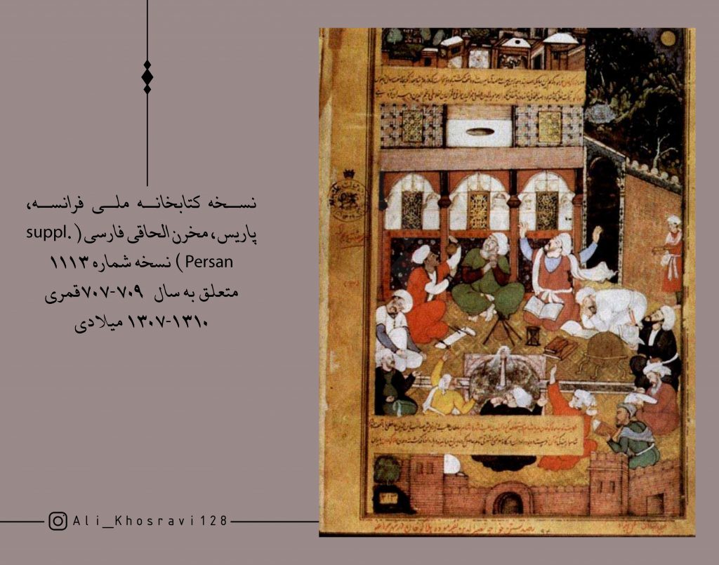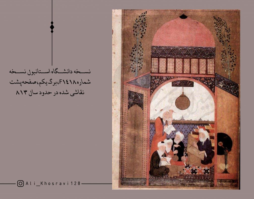 جالب است در اینجا خواجه نصیر چهره و لباسی دقیقاً مشابه با نسخه موزه ملک دارد، با همان فرم ریش نوک تیز، همان عمامه، و همان قبا منتهی با چشمانی متفاوت از فرم چشم مغولان(که اصالت چهرهی حقیقی او را تقویت می کند).