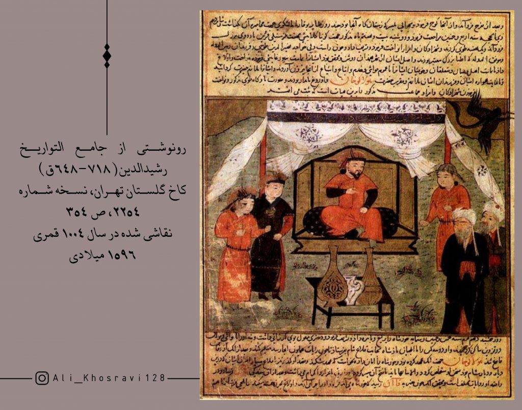 تصویر “۷” نیز رونوشتی از جامع التواریخ رشیدالدین(۶۴۸-۷۱۸ق) است که در کاخ گلستان تهران، نسخه شماره ۲۲۵۴، ص ۳۵۴ ، نگهداری می شود.