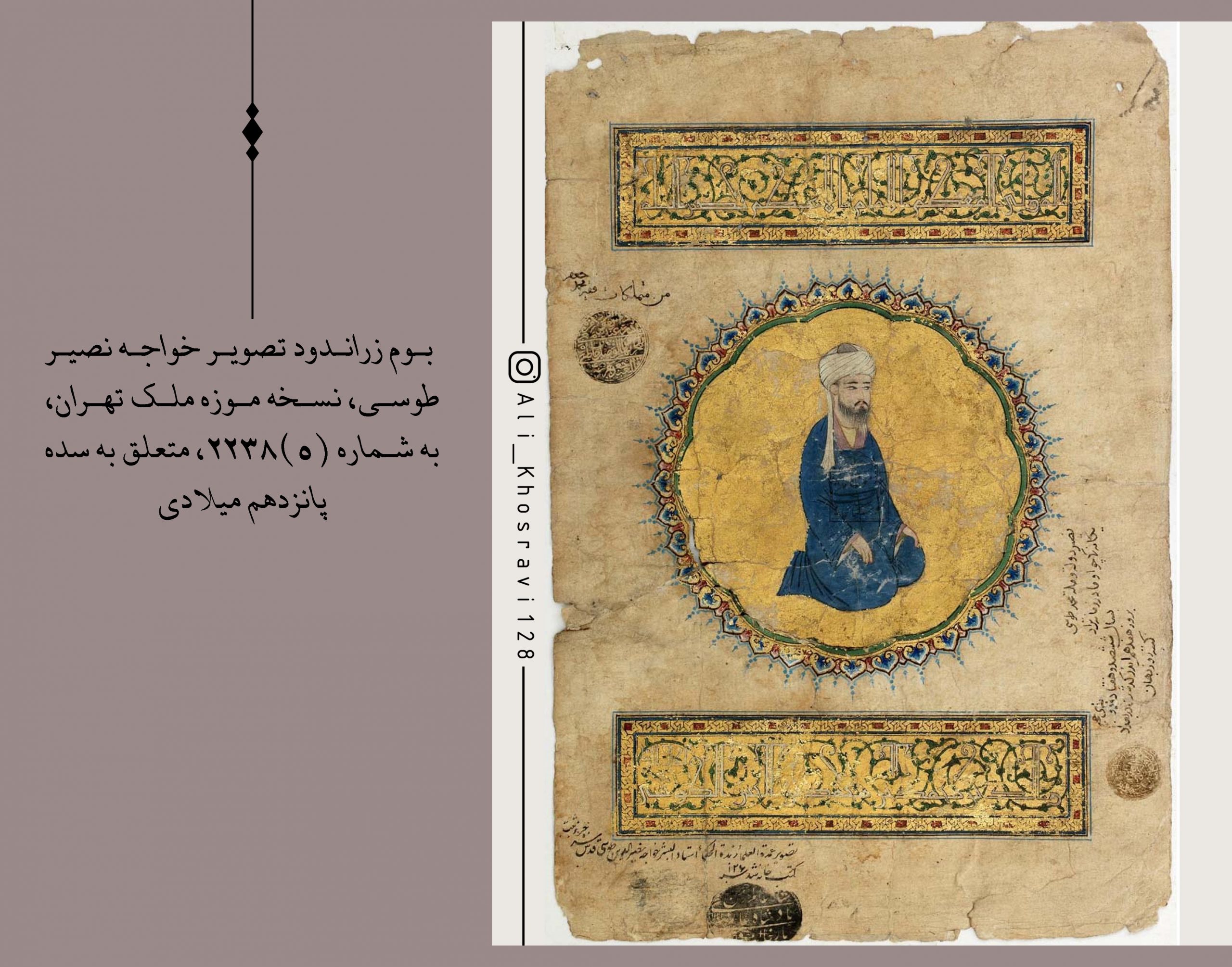 خواجه نصیر، روی بوم زراندود کشیده شده در قرن پازدهم که در موزه ملک تهران، به شماره (۵)۲۲۳۸ نگهداری می شود. به این منبع حضورا رجوع کردم.