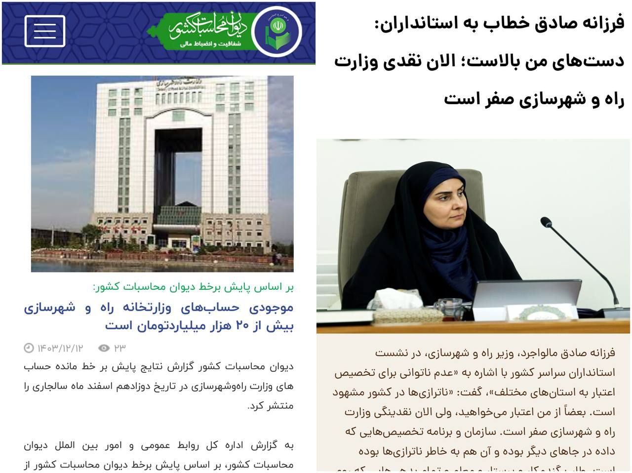ایلنا: پساز آنکه روز گذشته، فرزانه صادق (وزیر راه) مدعی شد موجودی نقدی وزارت راه و شهرسازی صفر است، امروز دیوان محاسبات کشور پایس برخط حسابهای این وزارتخانه را منتشر کرد. در گزارش نهاد نظارتی مجلس آمده است: در تاریخ دوازدهم اسفندماه ۱۴۰۳، موجودی حساب پرداخت اعتبارات وزارت راهوشهرسازی بالغ بر ۱۳۰۰ میلیاردتومان بوده است. همچنین موجودی شرکت ساختوتوسعه زیربناهای حملونقل بهعنوان یکی از زیرمجموعههای این وزارتخانه بالغ بر ۹۱۰۰ میلیاردتومان، موجودی حساب تنخواهگردان پرداخت ستاد سازمان بنادر و دریانوردی بالغ بر ۳۳۰۰ میلیاردتومان، موجودی حساب پرداخت اعتبارات سازمان مجری ساختمانها و تاسیسات دولتی بالغ بر ۱۱۰۰ میلیاردتومان.