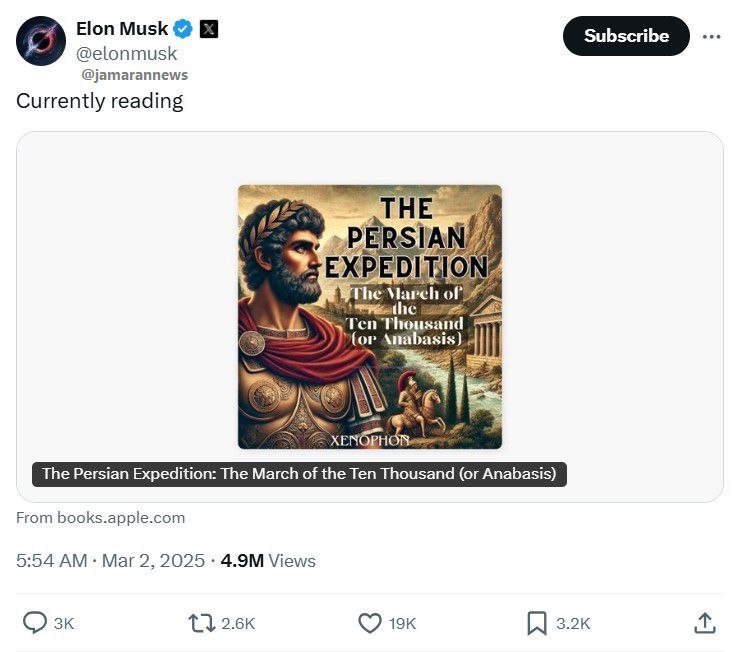 فرهیختگان: ایلان ماسک با انتشار پستی در شبکه اجتماعی ایکس گفته مشغول خواندن کتاب «The Persian Expedition: The March of the Ten Thousand» است.