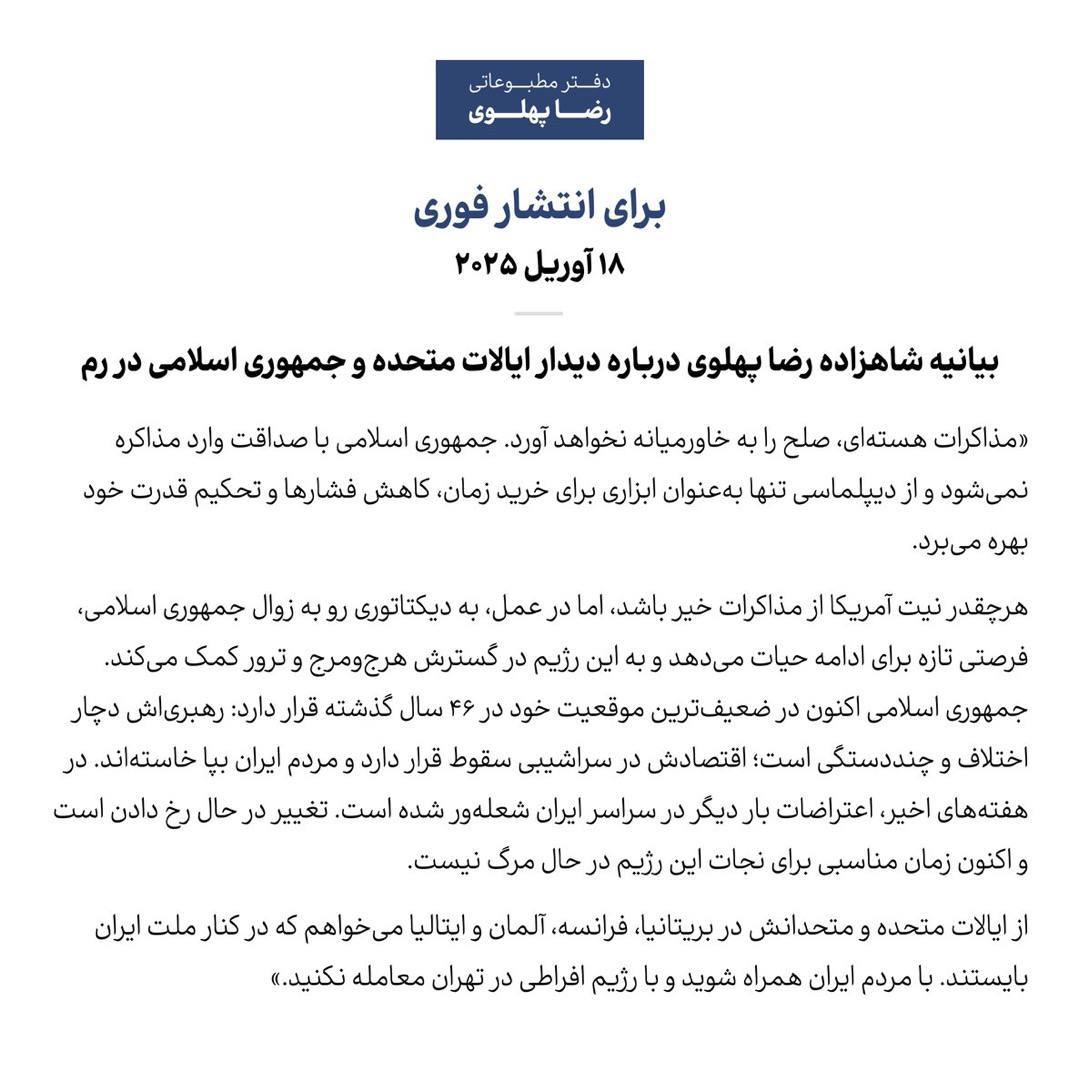 رضا پهلوی، با انتشار بیانیهای مطبوعاتی، از دولت آمریکا و متحدانش خواسته است که برای سرنگونی حکومت ایران [و امید به استقرار خانواده ایشان به عنوان خاندان سلطنتی ایران در راس امور]، به سیاست فشار حداکثری و تشدید تحریمها ادامه داده و از مذاکره و توافق خودداری کنند.