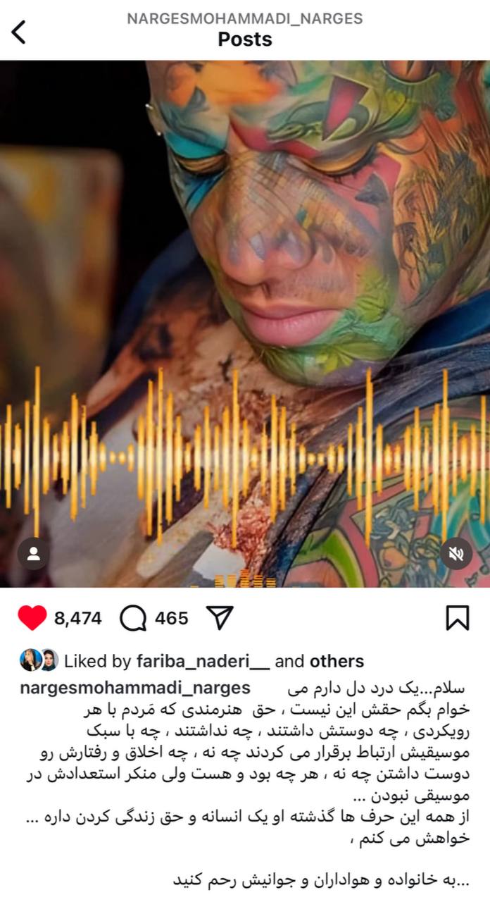 سایت برترینها: دقایقی پیش نرگس محمدی، با انتشار متنی احساسی در صفحه اینستاگرامش، به خبر اعدام شدن امیرحسین مقصودلو «امیر تتلو»، واکنش نشان داد.