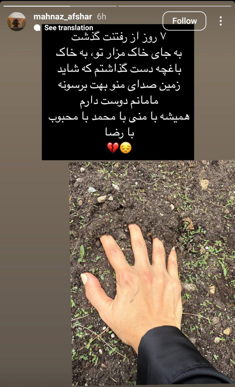 سایت برترین‌ها: مهناز افشار در هفتمین روز درگذشت مادرش با انتشار یک استوری احساسی در صفحه شخصی‌اش، از دلتنگی و اندوه خود نوشت.