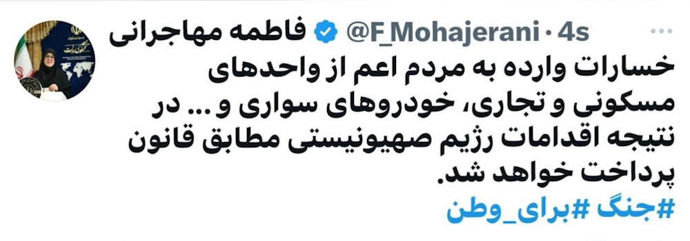 از سوی دیگر، فاطمه مهاجرانی، سخنگوی دولت چهاردهم روز ۲۵ خرداد ۰۴ در توئیتی نوشت: «خسارات وارده به مردم اعم از واحدهای مسکونی و تجاری، خودروهای سواری و… در نتیجه اقدامات رژیم صهیونیستی مطابق قانون پرداخت خواهد شد.»