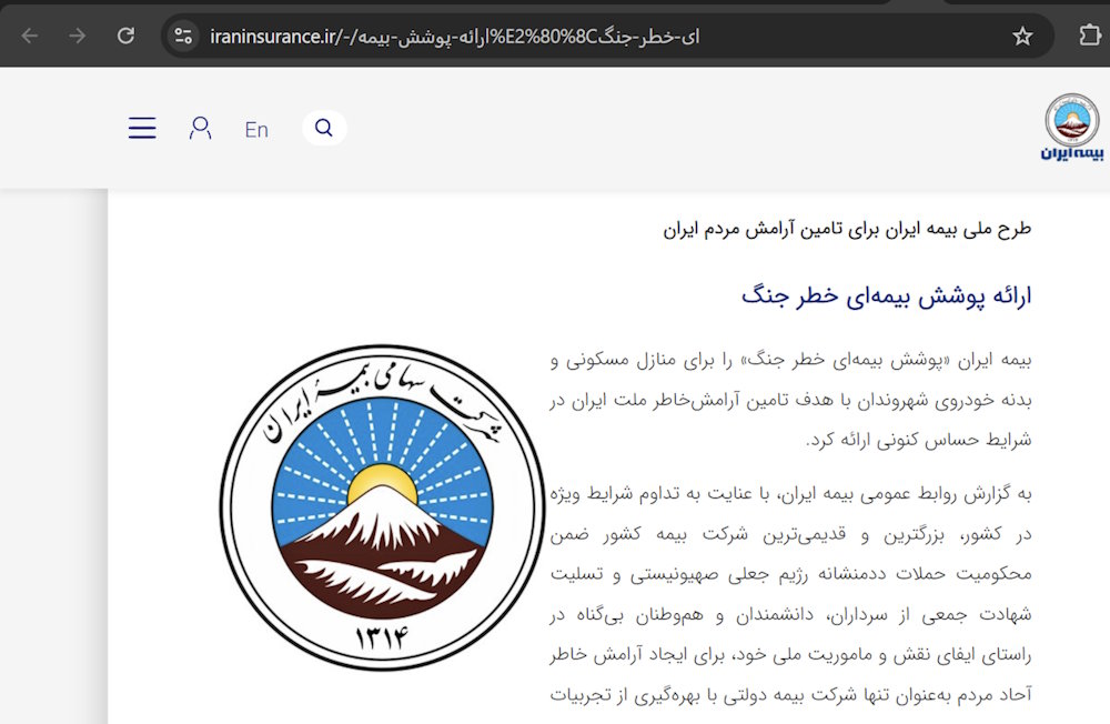 این بیمه دولتی، کمتر از یک هفته پس از آغاز جنگ، پیامک تبلیغاتی برای شهروندان ارسال کرده با عنوان «طرح ملی بیمه ایران برای آرامش مردم ایران»: «آمادگی بیمه ایران به عنوان بزرگترین و معتبرترین شرکت بیمه کشور برای ارائه پوشش بیمه خطر جنگ برای منازل مسکونی و بدنه خودرو شهروندان. بیمهگذاران و متقاضیان محترم میتوانند جهت تهیه پوشش تکمیلی فوق به شعب و نمایندگیهای شرکت سهامی بیمه ایران در سرتاسر کشور مراجعه نمایند.»