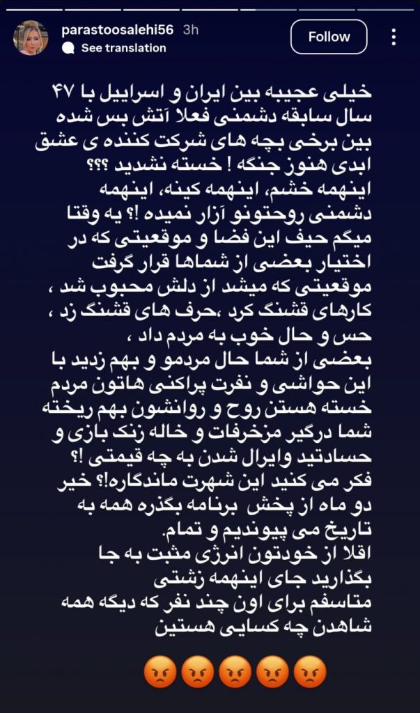 به گزارش انصاف نیوز، پرستو صالحی، مجری برنامهی عشق ابدی در استوری اینستاگرام خود نوشت: «خیلی عجیبه بین برخی بچههای شرکت کنندهی عشق ابدی هنوز جنگه! خسته نشدید؟ این همه خشم اینهمه کینه، اینهمه دشمنی روحتونو آزار نمیده!؟