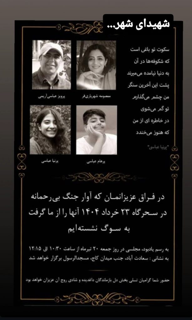 متن پیش رو مشاهدهی کوتاه خبرنگار انصاف نیوز از مراسم یادبود خانوادهی پرنیا عباسیست؛ یکی از خانوادههای غیرنظامیای که در حملهی اسرائیل به ایران شهید شدند.