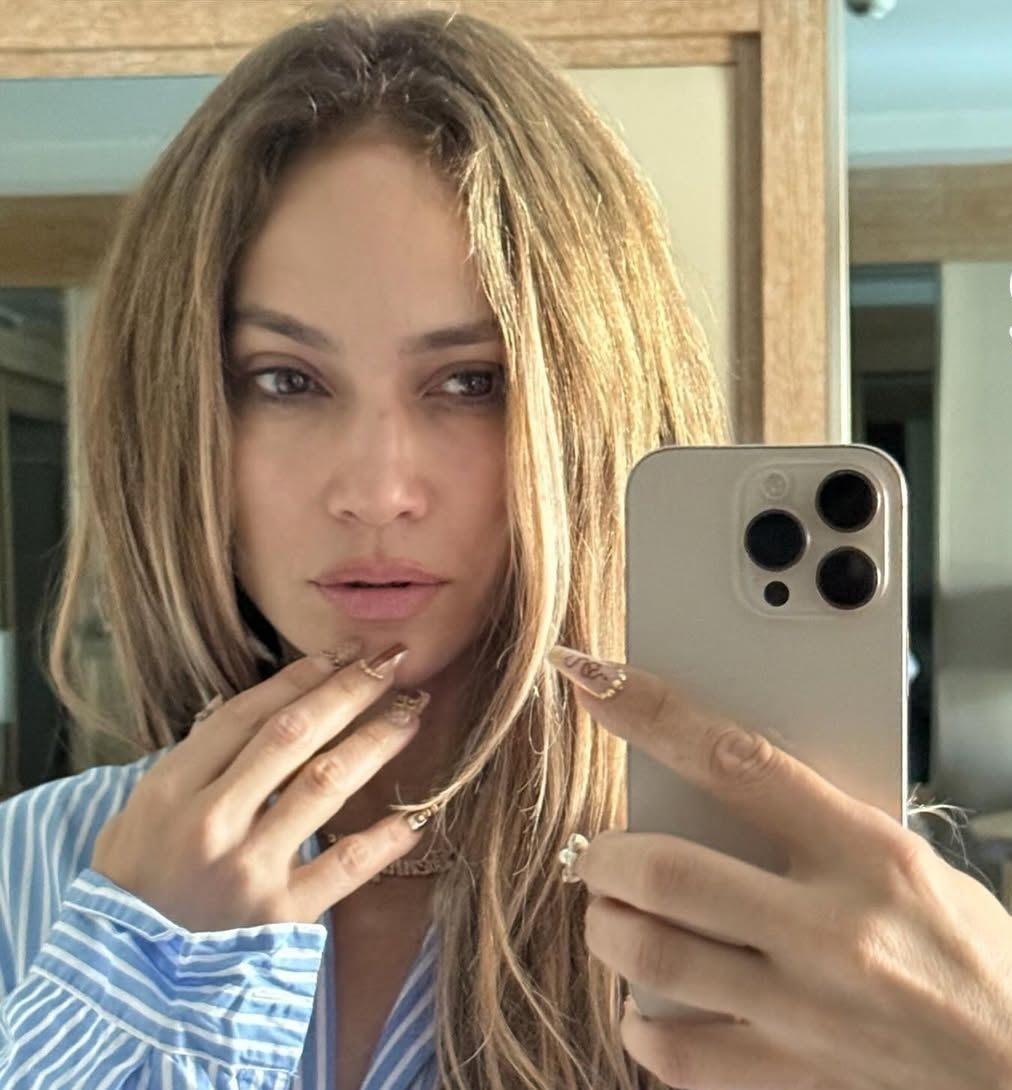 در این عکس، لوپز با ظاهری طبیعی مقابل آینه ایستاده و بدون هیچ آرایشی دیده می‌شود؛ تنها با یک پیراهن راه‌راه آبی و سفید. تصویری متفاوت از چهره همیشگی ستاره‌ای که اغلب با آرایش سنگین و لباس‌های پرزرق‌وبرق روی صحنه دیده می‌شود.